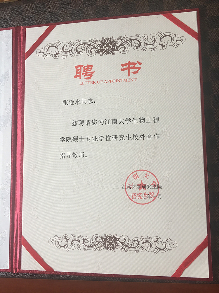 恭賀張連水總經理被聘為江南大學生物工程學院碩士專業學位研究生校外合作指導教師