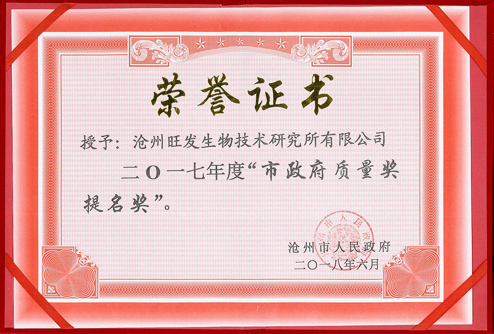 為全(quán)麵貫徹落實黨的十九大精神、國務院《質量發展綱要 ( 2011—2020年(nián))》和(hé)《中共中央(yāng)國務院關於開展質量提升行動的指導意見》、《中共河北省委河北省人民政府關於開展質量(liàng)提升行動加快質量強省建設的實施意見》,進一步引導(dǎo)和激(jī)勵全市各行各業按照高質量發展的要(yào)求,大力開展質量提升行動(dòng),深入推進質量強市建設,增強我市質量創新(xīn)能力和核心競爭力(lì),根據《滄(cāng)州市政府質量獎管理辦法(fǎ)》規定,市(shì)政府決定授予滄州草莓视频在线生物技術研究(jiū)所有(yǒu)限公司“市政府質量獎提(tí)名獎”。