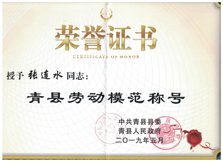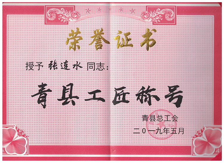 2013年以來,全(quán)縣各族人民深入貫徹落(luò)實習近平新時代中國特色社會主義思想和黨(dǎng)的十九大及十(shí)九屆二中、三中全會精神,積極投身(shēn)到加快建設創新(xīn)驅動經濟(jì)強縣的偉大(dà)事業中,在推進轉型發展、脫貧(pín)攻堅、同步小康(kāng)進(jìn)程等(děng)各條(tiáo)戰線上,湧現出一大批品德高尚、愛崗敬業、業(yè)務精湛、貢(gòng)獻突出的先(xiān)進模範人物。為弘揚先進模範人物的時代精神,凝聚(jù)和傳播正(zhèng)能量,縣委、縣政府決定,授予張連(lián)水(shuǐ)同誌“青(qīng)縣勞(láo)動模範”和“青縣工匠”稱號。