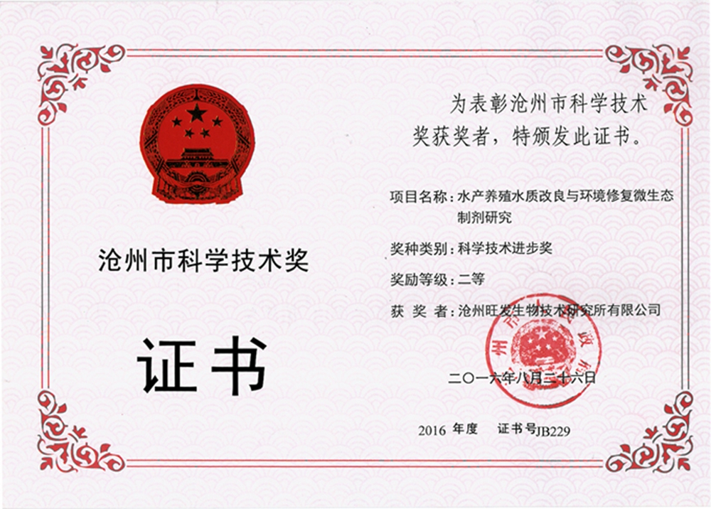 滄州市科學技術獎證書(水產養殖水質改良與環境修複微生態製劑研究)